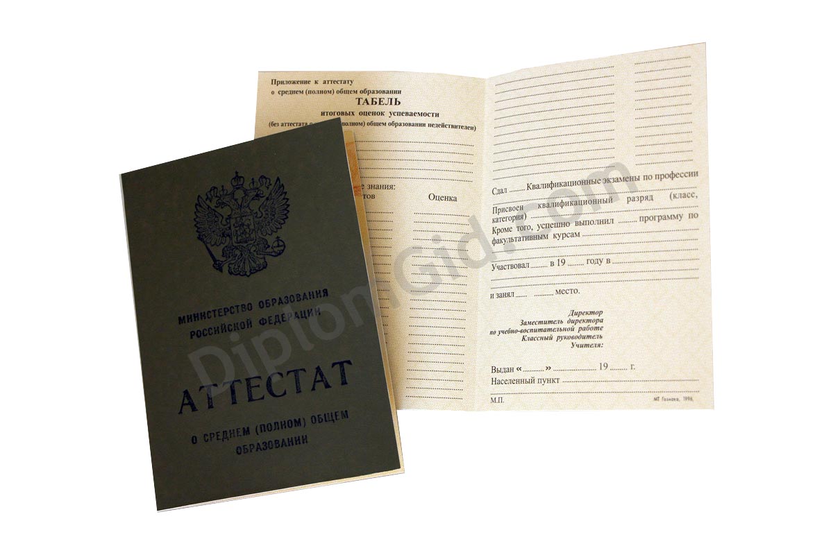 На нашем сайте Вы можете аттестат о среднем общем образовании (11 классов) без обучения, выданный любым школой Москвы и других городов России в период с 1994 по 2006 год. В комплект входит бланк, обложка и приложение, оформленные по всем стандартам.